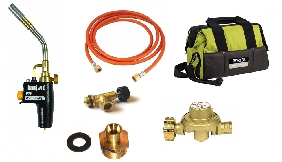 V praktické, pevné brašně RYOBI, jumbo hořák Bernzomatic TS8000, redukce na plynovou hadici G3/8˝LH, plynová hadice PB 2,5m se závitem G3/8˝LH, regulátor tlaku nastaven na 2 bary G3/8˝LH, uzavírací ventil na 2kg lahev s výstupem W 21,8 x 1/14˝LH