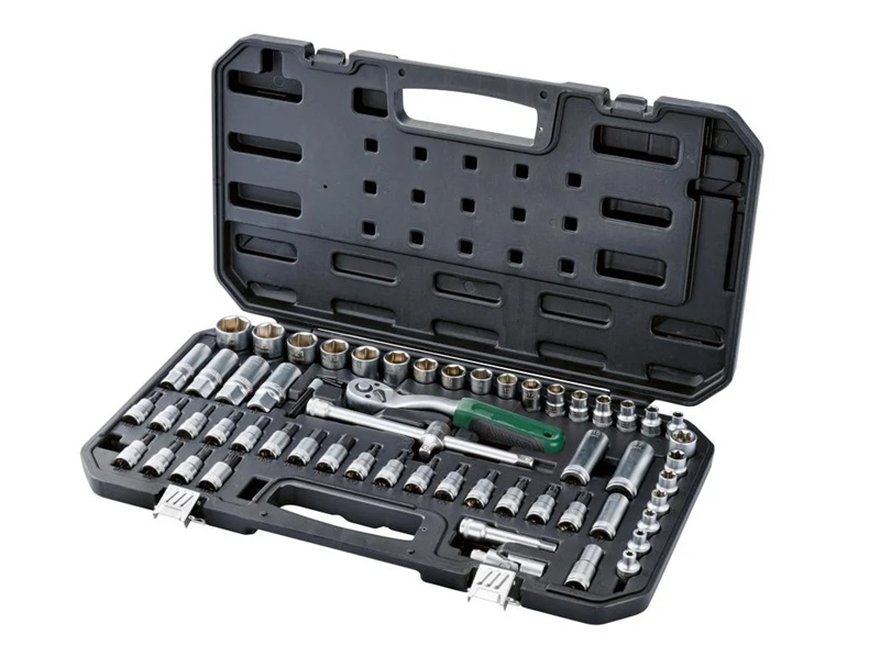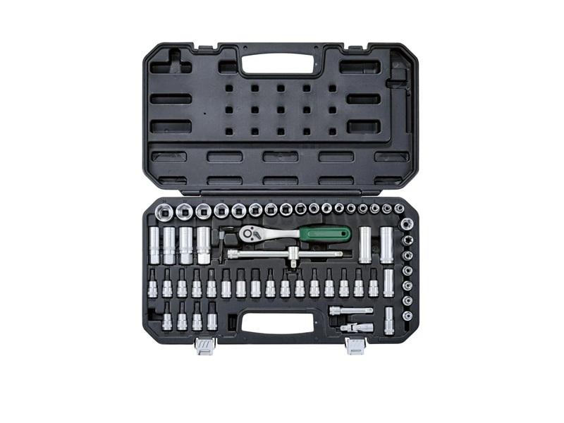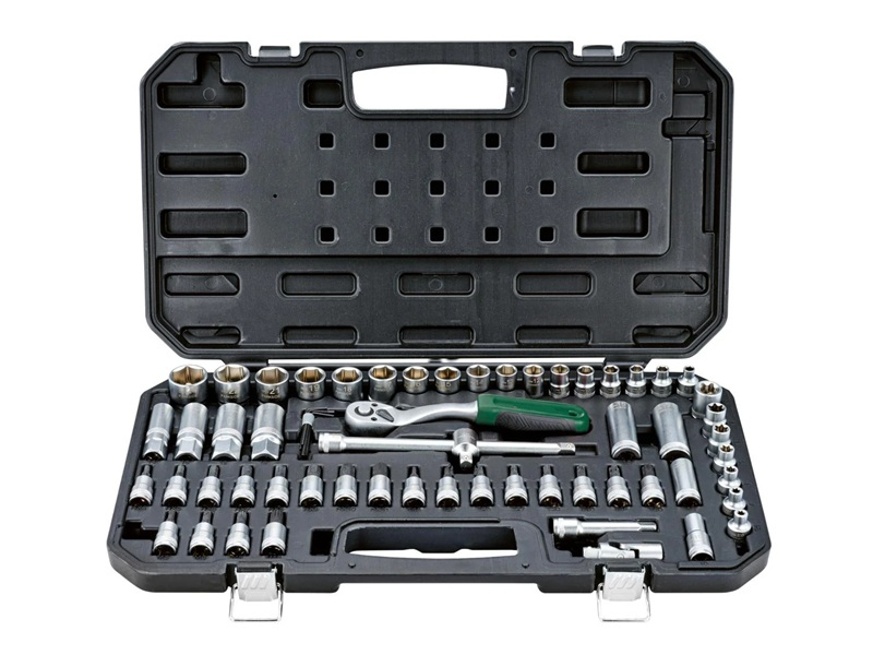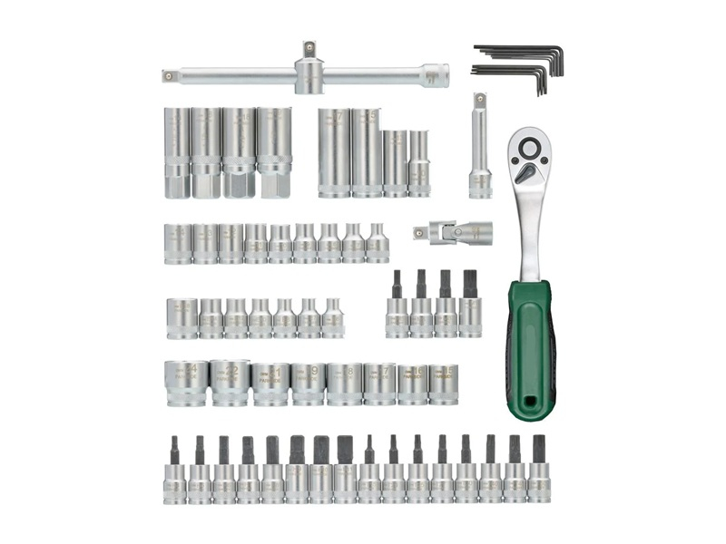 65 dílná sada s ořechy 6-7-8-9-10-11-12-13-14-15-16-17-18-19-21-22-24mm. Ergonomická ráčna. Vyrobeno z chrom-vanadiové oceli CR-V a oceli S2 s 3/8" (10 mm) uchycením. 1x ráčna, přepínatelná vpravo/vlevo (72 zubů) s vyhazovačem. 1x prodlužovací nástavec 75 mm. 1x prodlužovací nástavec 200 mm. 1x kluzák. 1x kardanový kloub. 4x klíče na zapalovací svíčky s laserem vyrytým piktogramem zapalovací svíčky. 4x prohloubený nástavec. 17x bit na nástrčný klíč. 20x bit šroubováku. 7x bit nástrčného klíče profil E. 5x imbusový klíč. 3x klíč torx. V matném provedení - dobře rozeznatelné velikosti díky laserovému označení. Včetně praktického plastového kufru 47,5 x 27,5 x 5,5 cm. Hmotnost 3,2kg