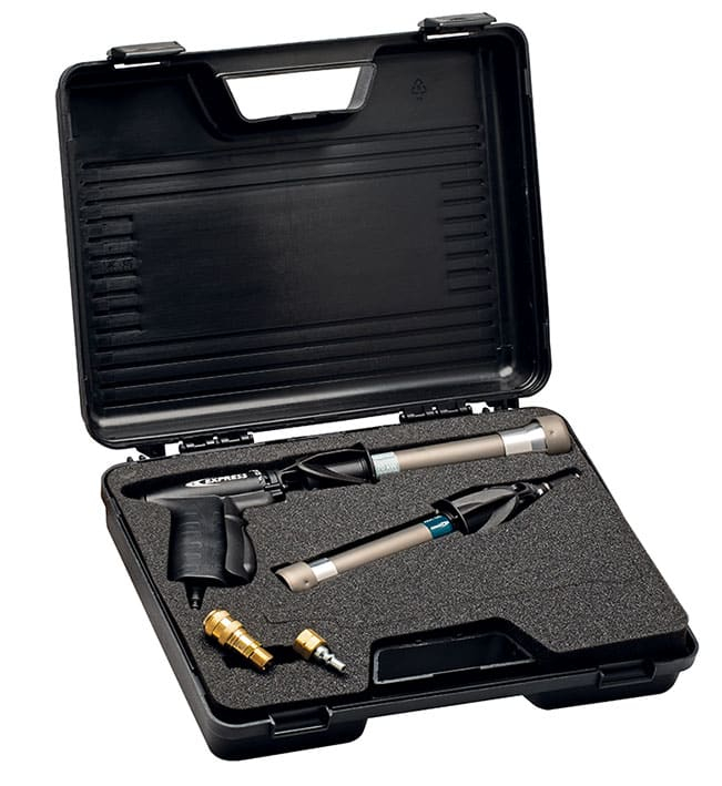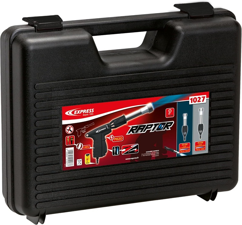 Guilbert Express profesionální, vysokovýkonný plynový hořák Raptor s piezzo zapalováním, bezpečnou rukojetí a rychlospojkou. Vyměnitelné hořáky bez potřeby nářadí, lehký titanový hořák, který vydrží velmi vysoké teploty, nárazy a eroze. Připojení hadice jedním kliknutím díky rychlospojce. Snadná samoúdržba: výměna spouště/piezozapalování také nevyžaduje žádné nástroje. Třípolohové značení: výměna hořáku, uložení, zapálení. Bezpečné zapalování s nízkým průtokem plynu. Bezpečnostní rukojeť (hořák se vypne, když obsluha pustí rukojeť). Velmi lehký (asi 500 g) tlumená hladina zvuku (< 81 dBA). Bezpečnostní rukojeť, kterou je hořák Raptor vybaven, přispívá k výraznému snížení spotřeby plynu a proto: snižuje emise CO2, zabraňuje riziku způsobení náhodných požárů na pracovištích a související škody na lidech a majetku. Hořák Raptor nabízí vysokou úroveň výkonu s cíleným plamenem a má k dispozici řadu hořáků od 30 do 160 kW. Raptor umožňuje provádět práce, které vyžadují vysoce přesný plamen. Sada v pevném a praktickém kufříku obsahuje: bezpečnostní rukojeť, trysku Raptor 30 kW - kat. č. 1030, trysku Raptor 70 kW - kat. č. 1070, rychlospojku kat. č. 911.