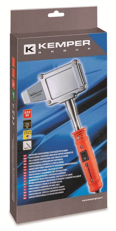 Kemper profesionální elektrická klempířská pájka. Pájecí kladívko 400g. Výkon 320W, napětí 230V. Teplota hrotu cca 480°C. Vypínač on/off. Vhodná zejména pro měkké profesionální pájení cínem a jeho slitinami. Hmotnost 1,1 kg. V kartonu.