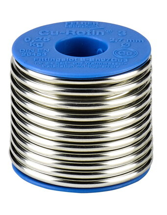 Felder pájka pro měkké pájení měděných trubek s měděnými, bronzovými a mosaznými tvarovkami pro instalaci studené a teplé vody a instalaci topení do 110°C.Zložení S-Sn97Ag3 (L-SnAg3) DIN EN 29453,dle DVGW pracovní výměr GW 2 a GW 7. Tavicí pásmo: solidus 221°C, liquidus 240°C. Průměr 2,0 mm, cívka 250 g
