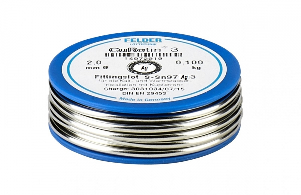 Felder pájka pro měkké pájení měděných trubek s měděnými, bronzovými a mosaznými tvarovkami pro instalaci studené a teplé vody a instalaci topení do 110°C.Zložení S-Sn97Ag3 (L-SnAg3) DIN EN 29453,dle DVGW pracovní výměr GW 2 a GW 7. Tavicí pásmo: solidus 221°C, liquidus 240°C. Ø 2,0 mm cívka 100 g