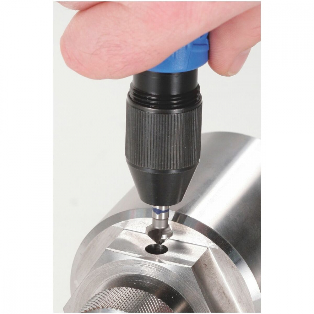 Robustní a pevná rukojeť se sklíčidlem NOGA PV1000. Univerzální hliníková sklíčidlová rukojeť s protiskuzným povrchem. 3-čel. sklíčidlo upne nože, nástavce, záhlubníky, šábry i pilníky. Tvrdost 58HRC. Upne klasické nože typu S a N (přes příslušný teleskopický nástavec), dále všechny typy teleskopických nástavců, oboustranné břity BT8001 a BT1200 , nože D50 , D55 , D66 , D75 a D77. Rozsah sklíčidla: 0,5 - 8,0mm. Bez nástrojů.