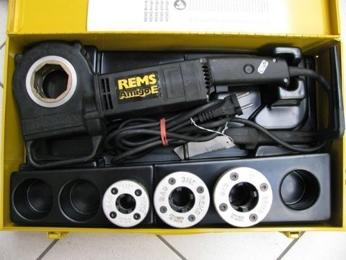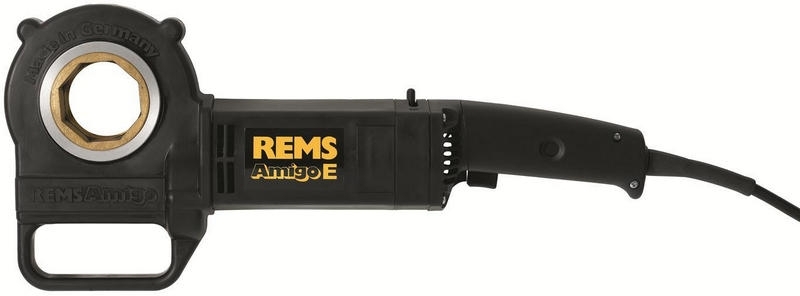 Rems Amigo E. Nejsilnější, nejlehší a nejrychlejší! Akční Set na trubkové závity R 1/2-3/4-1˝ s rychlovyměnitelnými závitořeznými hlavami a opěrnou vidlicí. Pravý a levý chod. Rozsah: 1/8–1˝, 16–32 mm. 230V/ 950W. V ocelovém kufru.
