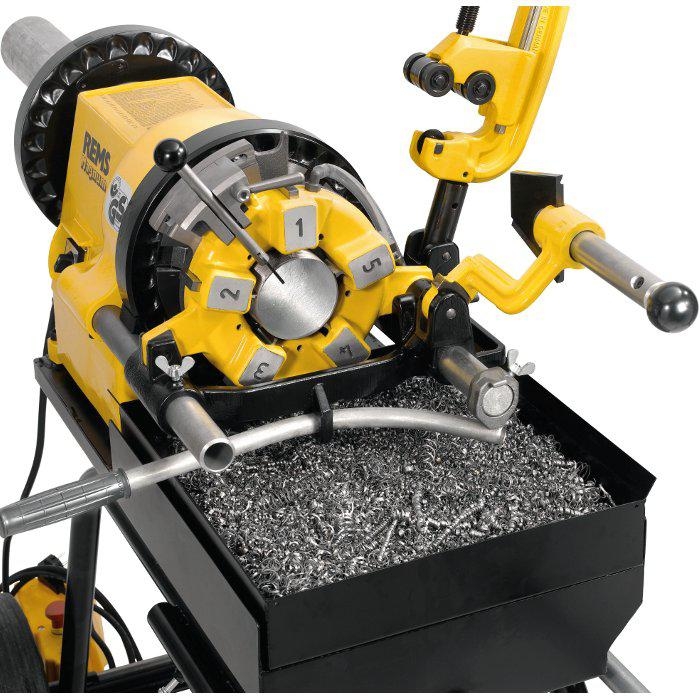 REMS Magnum - robustní, kompaktní vysoce výkonný stroj na řezání závitů, odřezávání trubek, odhrotování, výrobu vsuvek, výrobu obvodových drážek válcováním. Pro instalaci, dílny pracující s kovem, průmysl. Na staveniště i do dílny. Rozsah: Trubkové závity 1/16˝–2˝ (s REMS 4˝ automatickou závitořeznou hlavou 2 1/2˝-4˝), 16 - 63 mm, šroubové závity 6 – 63 mm. Komplet se závitořeznými čelistmi pro trubkové závity R 1/2˝-3/4˝, R 1˝– 2˝. Výkonný univerzální motor 230 V, 50 - 60 Hz, 1700 W, 23ot. 1/min. Přenosné provedení s odnímatelnou velkou vanou na olej a nádobou na třísky. Na pracovní stůl, podstavec alebo jezdící podvozek (volitelné příslušenství) s místem k odkládání materiálu.