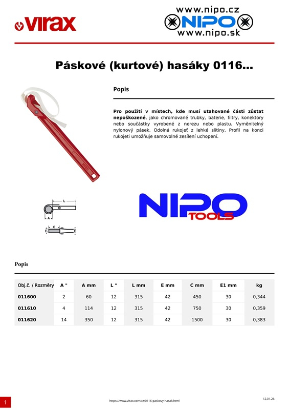 Profesionální páskové hasáky Virax umožňují pevné uchopení dílů s relativně hladkým povrchem jako trubky, baterie, filtry, konektory, fitinky nebo chromované armatury, díly z nerezové oceli, mědi, plastu a pod. Vyměnitelný, vysoce odolný nylonový pás. Rukojeť z vysoce odolné lehké slitiny.Profil na konci rukojeti umožňuje samovolné zesílení uchopení.